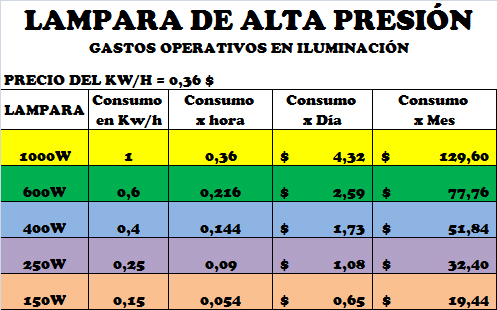 Para calcular el gasto eléctrico a fin de mes de tu Indoor, usa estos datos: Una lámpara de 1000w consume 1 kw por hora. (El precio del Kw no es igual en todo el país por lo que deberías aplicar el costo del Kw de tu factura de electricidad). Una lámpara de 400W consume 0,4 Kw por Hora.