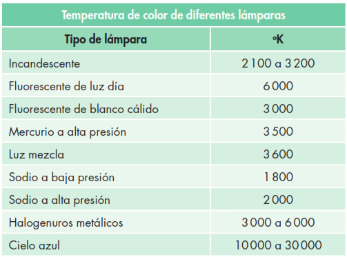 Una forma de describir una lámpara es indicar que temperatura de color tiene. Como se ve en la tabla expresados en grados Kelvin (K) y da la tonalidad de los colores de la luz.